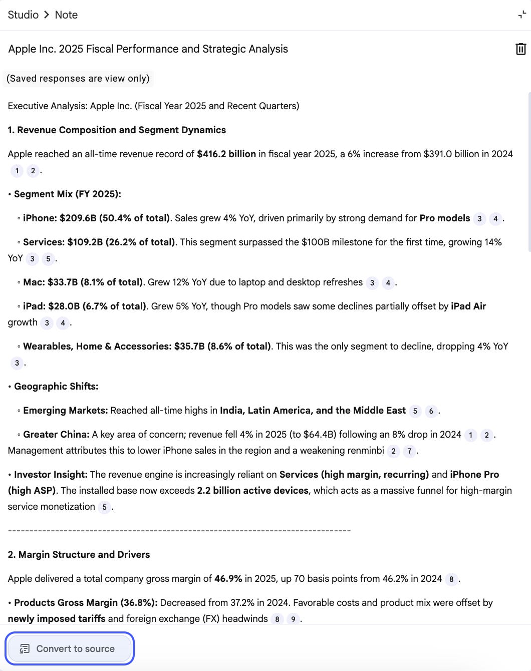PRO TIP: If you really like an answer or a report the Notebook produces, you can convert that into a Source (button on the bottom left) so the Notebook can use that as a grounded reference going forward.